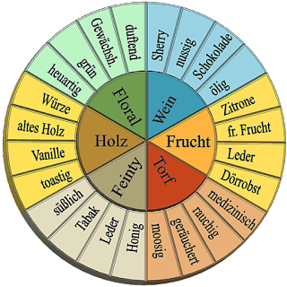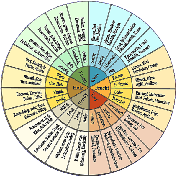 Dieses Aroma- Rad soll euch bei der Suche nach den richtigen Begriffen nur unterstützen. Am besten man findet seine eigenen Definitionen der Aromen. Man sagt es gibt bis zu 800 verschiedene Düfte und Geschmacksrichtungen in Single Malt Whiskys. Manche Düfte werden bei euch vielleicht persönliche Geruchserinnerungen wach rufen, die natürlich nur ihr kennen könnt. Dieses Aroma- Rad soll euch bei der Beschreibung der Aromen und Geschmackes eines Single Malt Whisky nur helfend unterstützen.