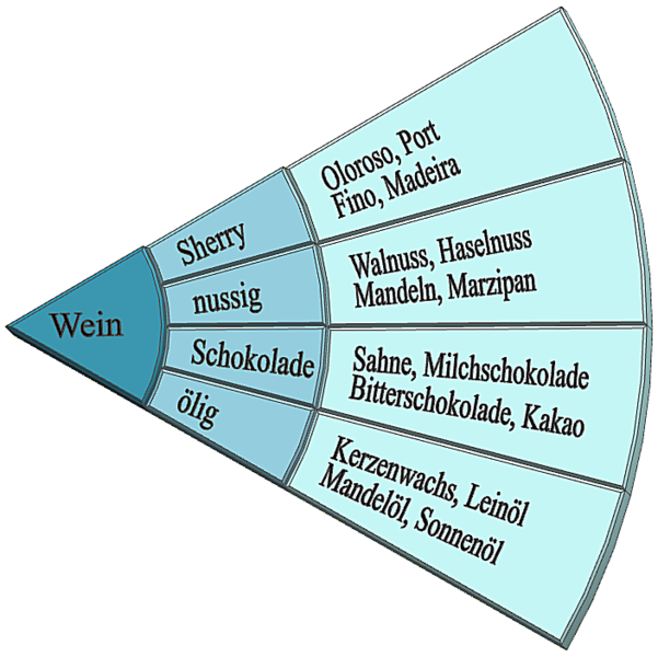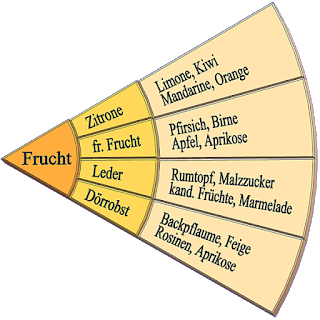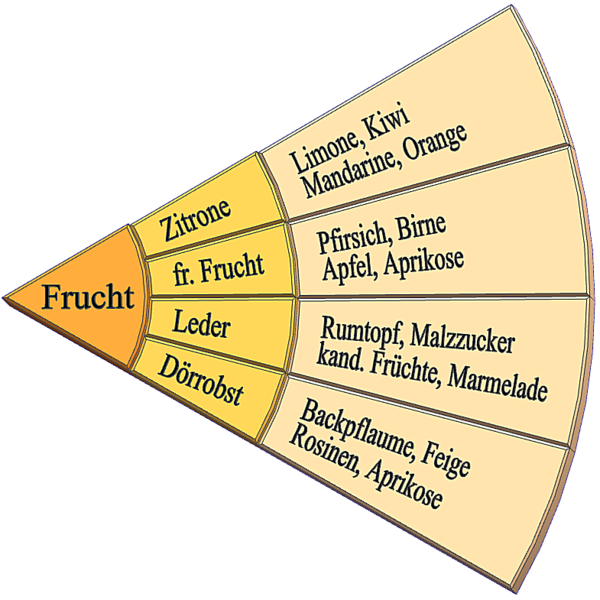 Der äußerste Kreis, schlüsselt jeweils die einzelnen Untergruppen wiederum auf. Diese Aufschlüsselung wird an spezifischen Aromen von Dingen festgemacht. In diesem Kreis werden auch die persönlichen Geschmackserinnerungen mit einfließen.
