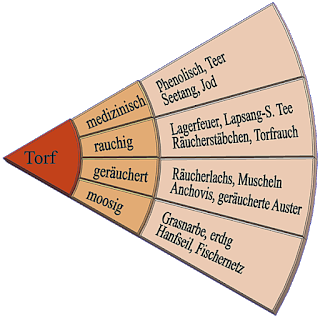 Auch phenolisch oder medizinisch: Aromen, die vor allem in Islay Whiskys reichlich vorhanden sind. Sie reichen von Holzrauch über Jod und Seetang bis zu Teer. Diese Aromen entstehen in der Hauptsache beim Darren des Malzes über Torf-, Holz- oder Holzkohlefeuer.